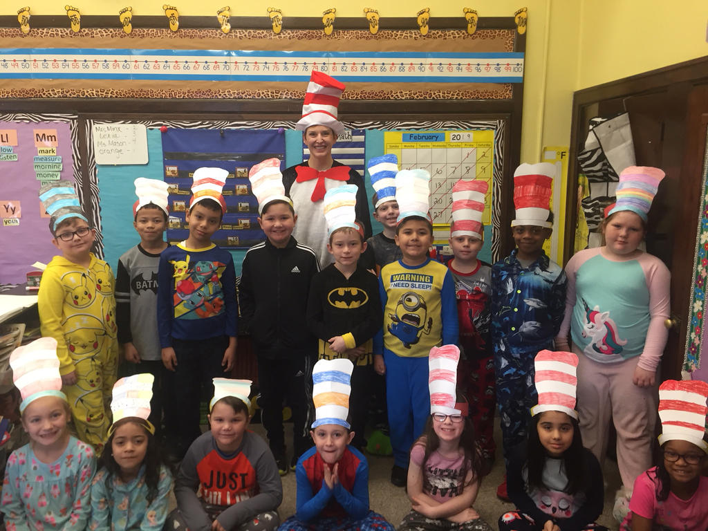 1st Grade students celebrated with a variety of activities corresponding with different Dr. Seuss stories. Students read, "There's a Wocket In My Pocket" and created their own version of a wocket. They used their math AND reading skills to graph goldfish crackers while reading "1 Fish, 2 Fish." They also designed their favorite meal as they read "Green Eggs & Ham." While reading "Horton and the Egg" students creatively combined different animals to make a new species. Everyone got to author their own rhyming poems like the story "The Cat in the Hat."
