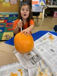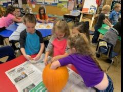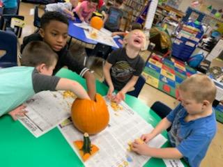 Mrs. Hodge's Kindergarten class recently celebrated with a Pumpkin Party. They earned this party by having 100% attendance during parent-teacher conferences. The students worked together to clean out the pumpkin and design the faces that would be carved on the pumpkins. They are going to have a taste test of the pumpkin seeds later this week, too!