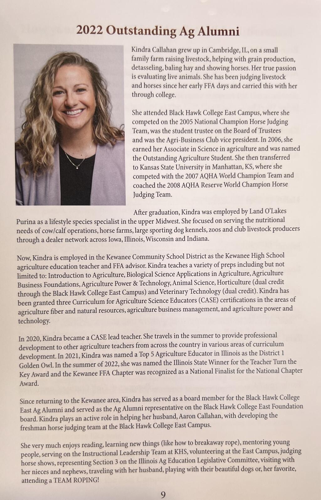 Kewanee High School Ag Teacher and FFA advisor Kindra Callahan received the prestigious honor of winning the Black Hawk East 2022 Outstanding Ag Alumni Award. Mrs. Callahan has an unwavering commitment to agriculture education, BHE, the FFA, and Kewanee High School.
