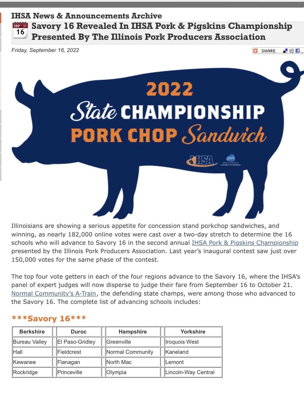 Kewanee High School is proud to announce that we have advanced to the IHSA Pork and Pigskins Championship Savory Sixteen! Congratulations to the Great Grillers of KHS!